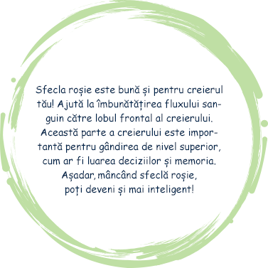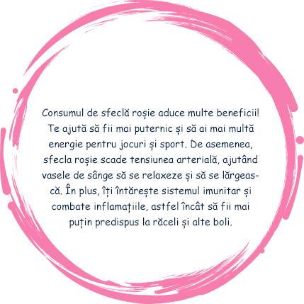 Consumul de sfeclă roșie aduce multe beneficii! Te ajută să fii mai puternic și să ai mai multă energie pentru jocuri și sport. De asemenea, sfecla roșie scade tensiunea arterială, ajutând vasele de sânge să se relaxeze și să se lărgească. În plus, îți întărește sistemul imunitar și combate inflamațiile, astfel încât să fii mai puțin predispus la răceli și alte boli.
